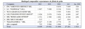 În același timp, analiza scoate în evidență reculul accentuat al unor jucători tradiționali. Cazul „MĂCINATORUL” SRL este relevant: după 5.150 de tone exportate în 2023, volumele au scăzut puternic în 2024, iar în 2025 livrările au devenit nesemnificative, compania practic oprind exporturile de făină.