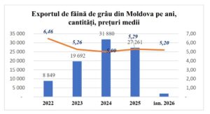 Datele din ianuarie 2026 indică un început de an prudent: au fost exportate 1.816 tone de făină, la un preț mediu de 5,20 lei/kg, cu încasări de 9,4 milioane lei.
