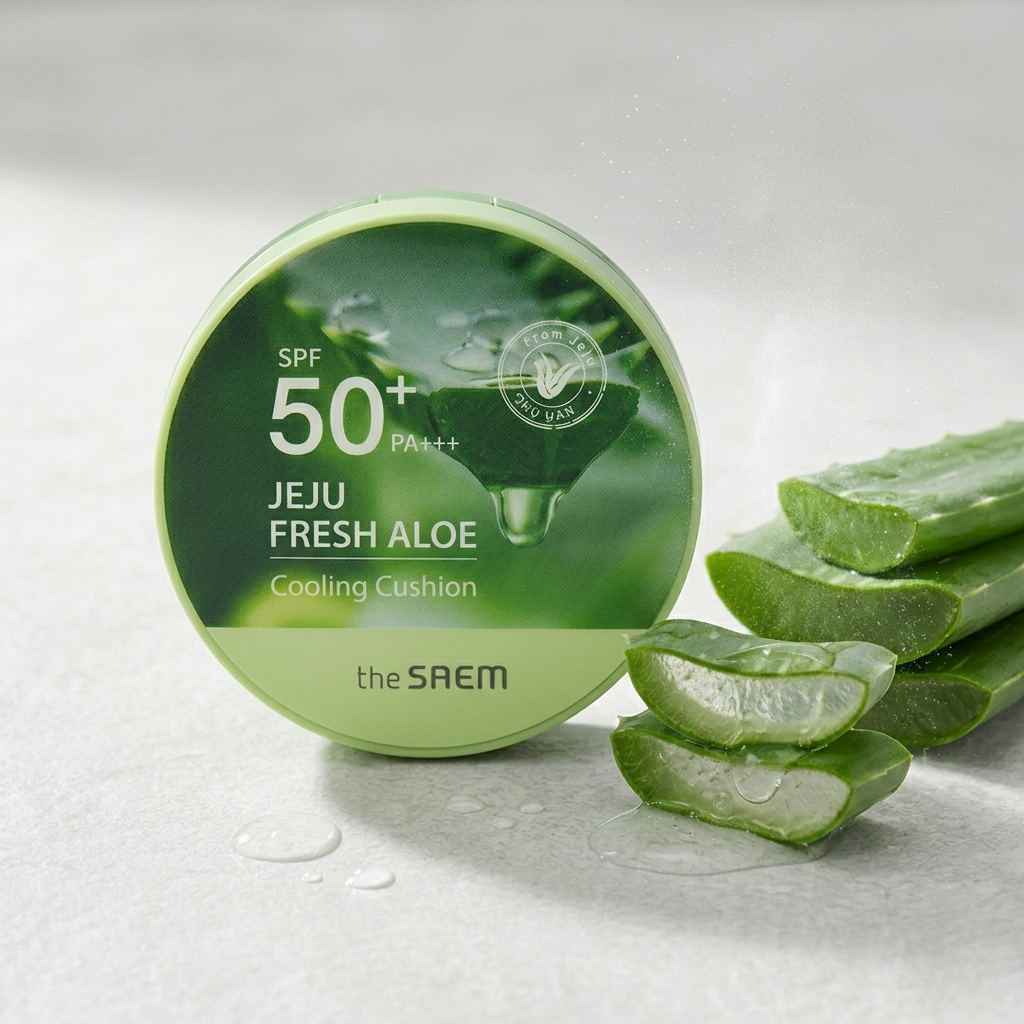 - Cushion cu SPF. Dacă se dorește un efect de prospețime instantanee, un cushion cu SPF precum cel de la the SAEM: Jeju Fresh Aloe este soluția ideală. Infuzat cu aloe vera din insula Jeju, acesta protejează împotriva razelor UV și calmează pielea expusă la soare. Prin simpla tapotare cu burețelul, tenul capătă un aspect revigorat și hidratat, ca și cum machiajul tocmai ar fi fost reîmprospătat.