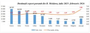 În februarie 2026 au fost exportate 38.800 tone și au marcat un vârf sezonier care a fost determinat în mare parte de eliberarea unor stocuri întârziate. Creșterea prețului mediu la 5,94 lei/kg, comparativ cu 3,69 lei/kg în ianuarie, a fost influențată de structura exporturilor, în care au intrat volume cu valoare ridicată. Astfel, 1.873 tone de porumb pentru însămânțare au fost exportate la un preț mediu de 48,71 lei/kg, 690 tone de porumb organic la 4,76 lei/kg, iar 67,5 tone de porumb pentru popcorn la 5,54 lei/kg. Totuși, baza exporturilor a fost porumbul convențional, în volum de 36.169 tone, comercializat la un preț mediu de 3,74 lei/kg, ceea ce arată că luna februarie reprezintă mai degrabă un vârf tehnic decât o schimbare structurală a pieței.