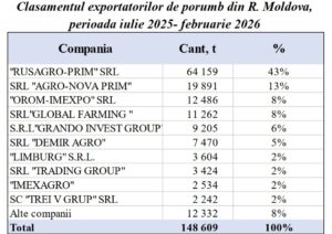 Structura pieței este dominată de câțiva actori majori, primele trei companii: „RUSAGRO-PRIM” SRL, „AGRO-NOVA PRIM” SRL și „OROM-IMEXPO” SRL și cumulează 65% din totalul exporturilor. Liderul „RUSAGRO-PRIM” deține singur o cotă de 43% și confirmă o concentrare puternică a fluxurilor comerciale.