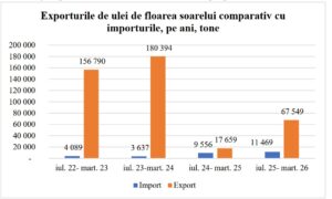 Sezonul curent 2025–2026 (iulie 2025 – martie 2026) aduce o reconfigurare a balanței comerciale. Față de 67.549 tone de ulei expediate la export, țara a importat 11.469 tone și a rezultat un raport de doar 5,89, un indicator al reducerii capacității de producție internă raportat la cererea de consum.