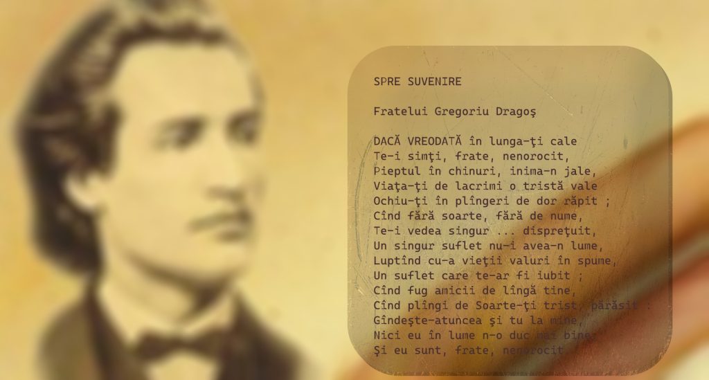 Grupul de presă „Realitatea” și „Vinul Muzical Mihai Eminescu” de la Mileștii Mici a lansat, duminică, 15 ianuarie curent, campania „Luna lui Eminescu”, ziua în care s-a născut și în care moldovenii îl comemorează. SPRE SUVENIRE Fratelui Gregoriu Dragoş DACĂ VREODATĂ în lunga-ţi cale Te-i simţi, frate, nenorocit, Pieptul în chinuri, inima-n jale, Viaţa-ţi de … Continuă lectura Luna lui Eminescu: „SPRE SUVENIRE”