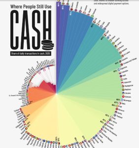 Myanmar ocupă primul loc în clasament, cu 98% utilizare de numerar în tranzacții zilnice, urmat de Etiopia și Gambia, cu 95%. Țări cu venituri medii precum Cambodgia, Laos sau Nepal depășesc 90%. India, datorită sistemului digital UPI, a redus dependența la 70%. Avansul economic și digitalizarea duc treptat la diminuarea utilizării numerarului.