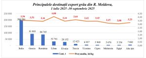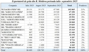 Exporturile de grâu din Republica Moldova au înregistrat, în perioada iulie–septembrie 2025, cea mai bună performanță din ultimii patru ani, arată analiza economistului Iurie Rija. În doar trei luni, peste hotare au plecat 483,4 mii tone de grâu, la un preț mediu de 3,53 lei/kg. Volumul actual este cu 42% mai mare decât cel din aceeași perioadă a anului 2024, când s-au livrat 340 mii tone, și cu 19% peste nivelul din 2023, de 406 mii tone. Totuși, anul record 2021, când Moldova a exportat 675,7 mii tone în același interval, rămâne de neatins.