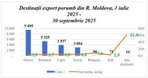 Ca urmare, valoarea totală a exporturilor de porumb s-a redus la 87,9 milioane lei în iulie–septembrie 2025 — cu 5% mai puțin decât în 2024 și de aproape cinci ori mai mică decât recordul din 2022, care a depășit 426 milioane lei. În luna septembrie, livrările externe au fost de doar 1 943 tone, cel mai scăzut nivel lunar din ultimii cinci ani.