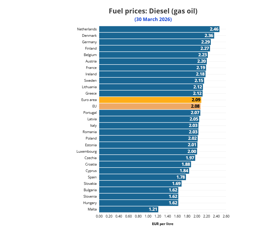 Diferențele între state sunt considerabile. Motorina este cea mai scumpă în Țările de Jos, unde ajunge la aproximativ 2,46 euro pe litru. Prețuri ridicate se înregistrează și în Danemarca (circa 2,36 euro), Germania (2,29 euro), Finlanda (2,27 euro) și Belgia (2,23 euro), iar peste media europeană se situează și Austria, Franța, Irlanda, Suedia, Lituania și Grecia. La polul opus, cea mai ieftină motorină se găsește în Malta, unde costă aproximativ 1,21 euro pe litru. Niveluri reduse se înregistrează și în Ungaria, Slovenia și Bulgaria, cu aproximativ 1,62 euro pe litru, în timp ce în Slovacia, Spania, Cipru, Croația și Cehia prețurile rămân sub pragul de 2 euro.