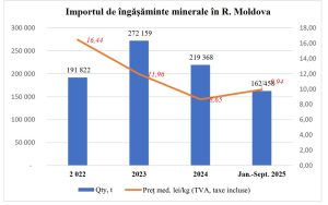 Piața îngrășămintelor minerale din Republica Moldova a traversat între 2022–2025 un ciclu de ajustare structurală, cu scăderi de consum din 2024, dar fără prăbușirea proporțională a producțiilor agricole în condițiile unui regim pluviometric similar, arată o analiză a economistului Iurie Rija. După șocul din 2022, când s-au importat 191,8 mii tone la un preț mediu foarte ridicat, de 16,44 lei/kg (efectul crizei gazelor și al tensiunilor geopolitice), 2023 a adus o revenire de volum la 272,1 mii tone (+40% față de 2022), concomitent cu ieftinirea la 11,96 lei/kg. În 2024, importurile au coborât la 209 mii tone (-23% vs 2023), iar prețul mediu a atins minimul ultimilor cinci ani, 8,65 lei/kg. În primele nouă luni din 2025 s-au importat circa 153 mii tone, la 9,94 lei/kg, ritm încă lent, în contextul în care vârful sezonier rămâne februarie–aprilie.