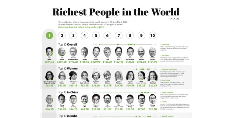 Cei mai bogați zece oameni ai planetei au adunat cumulativ 890 miliarde USD din martie anul curent, scrie visualcapitalist. De exemplu, Elon Musk și-a crescut averea sa cu cel puțin 1.116% în ultimul an. Între timp, Jeff Bezos de la Amazon a câștigat încă 89 de miliarde de dolari. De la debutul pandemiei, Musk averea … Continuă lectura Topul celor mai bogați oameni ai planetei în anul 2021