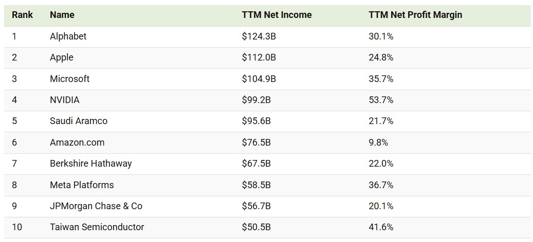 Clasamentul celor mai profitabile companii din lume în 2025 evidențiază o concentrare puternică a veniturilor în domeniile tehnologiei, finanțelor și energiei. Ca și în anii precedenți, firmele de tehnologie domină topul clasamentului. Alphabet a câștigat 124,3 miliarde de dolari în ultimele 12 luni, urmată îndeaproape de Apple și Microsoft. Aceste companii beneficiază de servicii digitale cu marjă ridicată, platforme de publicitate și software pentru întreprinderi, toate acestea scalându-se eficient.