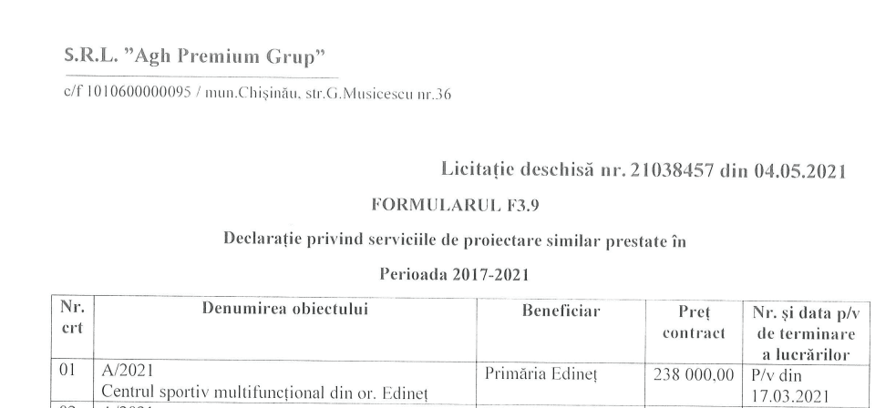 Erorile de calcul contrastează cu experiența companiei de proiectare. Documentele oficiale arată că SRL AGH Premium Grup a lucrat în mod constant la proiecte publice. În portofoliul său se regăsesc reconstrucția Curții de Apel Chișinău, lucrări la sediul Procuraturii Generale, elaborarea documentației pentru 20 de inspectorate de poliție din întreaga țară, precum și proiectarea unui complex sportiv în Anenii Noi. Pentru proiectul din Edineț, compania a fost plătită cu 238 000 de lei, lucrările fiind predate în martie 2021. Cu toate acestea, o expertiză independentă și specialiștii de la Agenția de Dezvoltare Regională Nord au constatat că proiectele conțin „soluții concepute necorespunzător”.