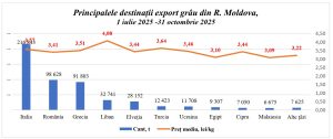 Schimbări semnificative apar și în structura geografică a exporturilor. Italia a devenit principalul cumpărător de grâu moldovenesc, preluând 41% din volumul total — echivalentul a 216,8 mii tone, la un preț mediu de 3,57 lei/kg. România a absorbit aproape 19% (98,6 mii tone), iar Grecia 91,8 mii tone. Libanul, un mare consumator de cereale, a plătit cel mai mare preț mediu — 4,08 lei/kg — pentru 32,7 mii tone.
