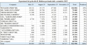 În clasamentul exportatorilor, lider absolut este „RUSAGRO-PRIM” SRL, cu 104,8 mii tone exportate, adică 20% din totalul național. Urmează „AGRO-NOVA PRIM” cu 75,8 mii tone (15%), iar pe locul trei „OROM-IMEXPO” SRL cu 71,4 mii tone (14%). În top se mai regăsesc „GLOBAL FARMING” (39,6 mii tone) și „AGROFLORIS-NORD” (27,3 mii tone), ultima reintrând pe piață după absența din sezonul anterior.