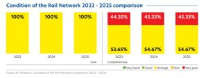 Calea ferată din Republica Moldova se află într-o stare critică. 100% din rețeaua TEN-T de bază este clasificată ca fiind în stare proastă, iar aproape 45% din rețeaua extinsă este evaluată ca foarte degradată, în condițiile în care trenurile circulă cu doar 48% din viteza pentru care infrastructura a fost proiectată, iar vitezele maxime nu depășesc 80 km/h, arată raportul TEN-T pentru perioada 2023–2025.